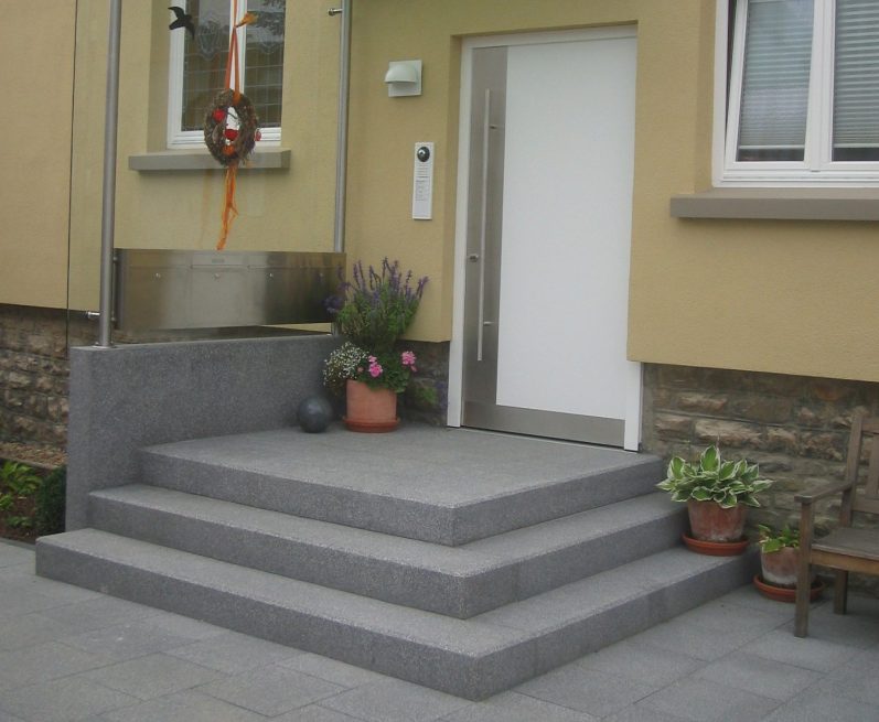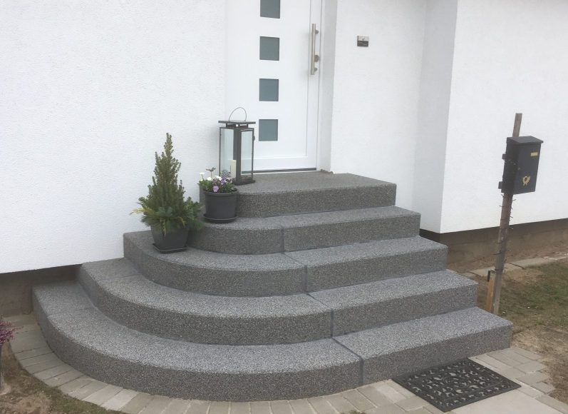 Bei der geschlossenen Aussentreppe handelt es sich um eine, wie der Name schon sagt, geschlossene Konstruktion, bei der sowohl Tritt- als auch Setzstufenfläche komplett geschlossen sind. Diese Treppenkonstruktion kann aus Blockstufen, Winkelstufen oder auch aus Tritt- und Setzstufen hergestellt werden. Als Materialien kommen schlichte Betonstufen, Betonwerksteinstufen mit verschiedenen Oberflächen, z.B. gewaschen, gestrahlt oder gestockt, oder Natursteinstufen mit rauhen trittsicheren Oberflächen, zum Einsatz. Bei den Unterkonstruktionen werden verschiedene Möglichkeiten genutzt.