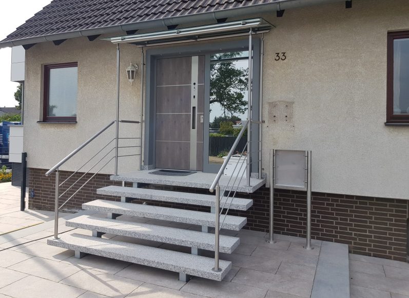 Bei beiden Treppenausführungen sollte man, bei Höhen über 1 m Absturzhöhe, die Geländerkonstruktion mit bei der Planung berücksichtigen. Lassen Sie uns, gemeinsam mit Ihnen, die individuelle Konstruktion der Aussentreppe erarbeiten. Jede Aussentreppe, das heißt die Gestaltung des individuellen Eingangsbereiches, ist ein Unikat.